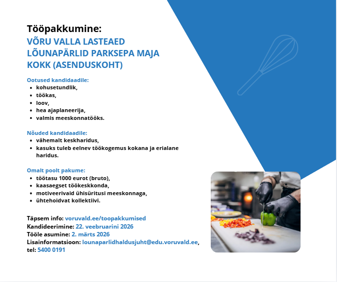 Mahetoitlustus haridusasutustes Loomise kuupäev 11.12.2025 Autor Maire Post Tööpakkumine - logopeed/eripedagoog Loomise kuupäev 27.11.2025 Autor Karmen Meltz Võru valla lasteaed Lõunapärlid Sõmerpalu maja õpetajad said inspiratsiooni Erasmus+ koolitustelt. Loomise kuupäev 06.11.2025 Autor Anneli Laursoo-Dunaiski Väimela maja tähistab 80. aastapäeva. Loomise kuupäev 08.10.2025 Autor Anneli Laursoo-Dunaiski Vaata rohkem