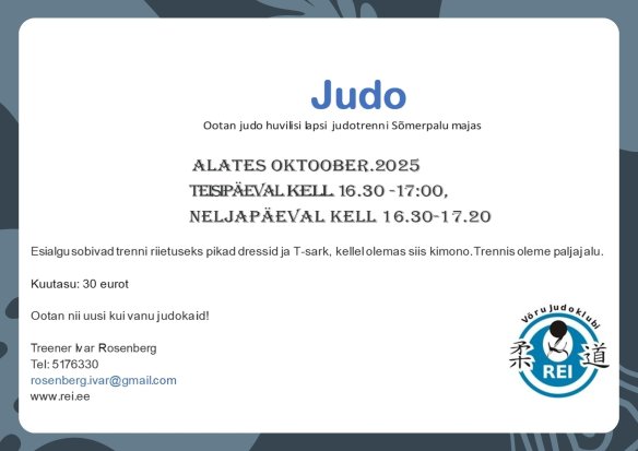 - JUDO 4-7 AASTASTELE LASTELE, VÕRU JUDOKLUBI REI, TEISIPÄEVITI KELL 16.30-17.00 JA NELJAPÄEVITI KELL 16.30-17.20.