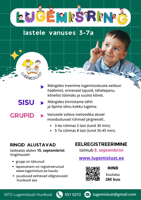 - LUGEMISRING 3-7 AASTASTELE LASTELE, MTÜ LUGEMISLUST HUVIKOOL, NELJAPÄEVITI VASTAVALT VANUSEGRUPPIDELE III GRUPIS ALGUSEGA KELL 14.45-16.40.
