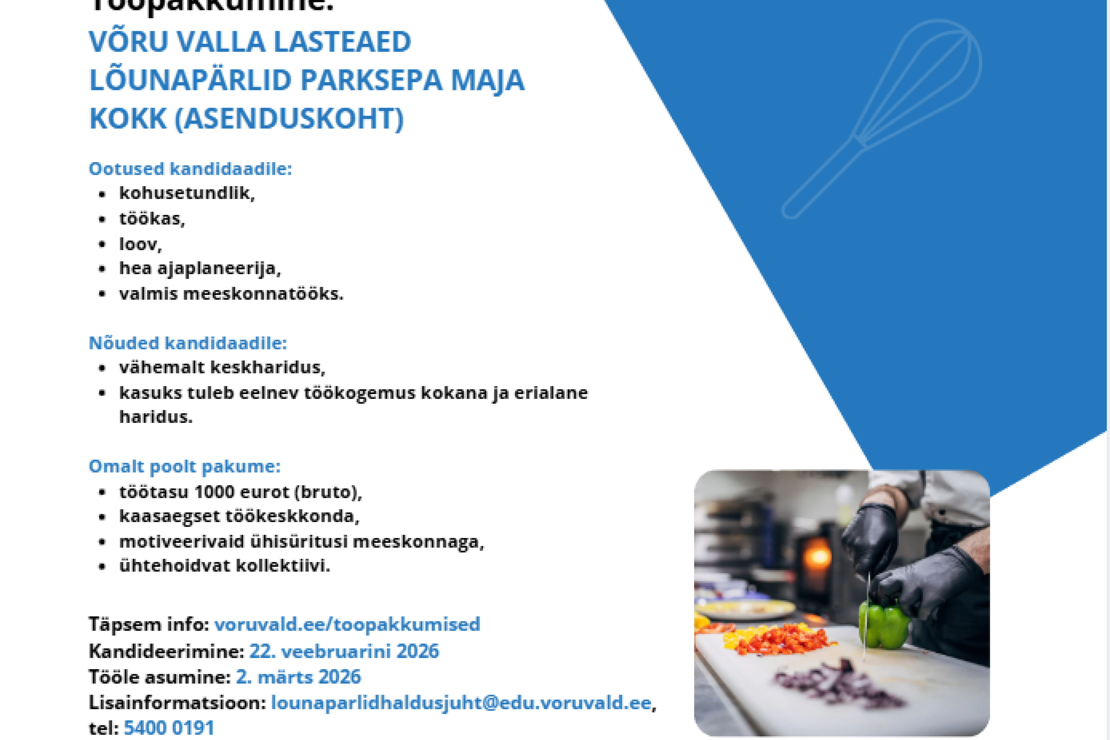 Mahetoitlustus haridusasutustes Loomise kuupäev 11.12.2025 Autor Maire Post Tööpakkumine - logopeed/eripedagoog Loomise kuupäev 27.11.2025 Autor Karmen Meltz Võru valla lasteaed Lõunapärlid Sõmerpalu maja õpetajad said inspiratsiooni Erasmus+ koolitustelt. Loomise kuupäev 06.11.2025 Autor Anneli Laursoo-Dunaiski Väimela maja tähistab 80. aastapäeva. Loomise kuupäev 08.10.2025 Autor Anneli Laursoo-Dunaiski Vaata rohkem