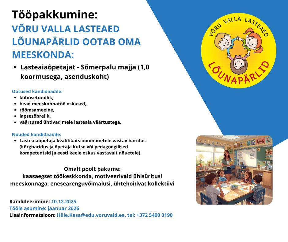 Tööpakkumine - logopeed/eripedagoog Loomise kuupäev 27.11.2025 Autor Karmen Meltz Võru valla lasteaed Lõunapärlid Sõmerpalu maja õpetajad said inspiratsiooni Erasmus+ koolitustelt. Loomise kuupäev 06.11.2025 Autor Anneli Laursoo-Dunaiski Väimela maja tähistab 80. aastapäeva. Loomise kuupäev 08.10.2025 Autor Anneli Laursoo-Dunaiski Võru maakonna haridustöötajate ja täiskasvanuhariduse tänusündmus Loomise kuupäev 29.09.2025 Autor Anneli Laursoo-Dunaiski Vaata rohkem