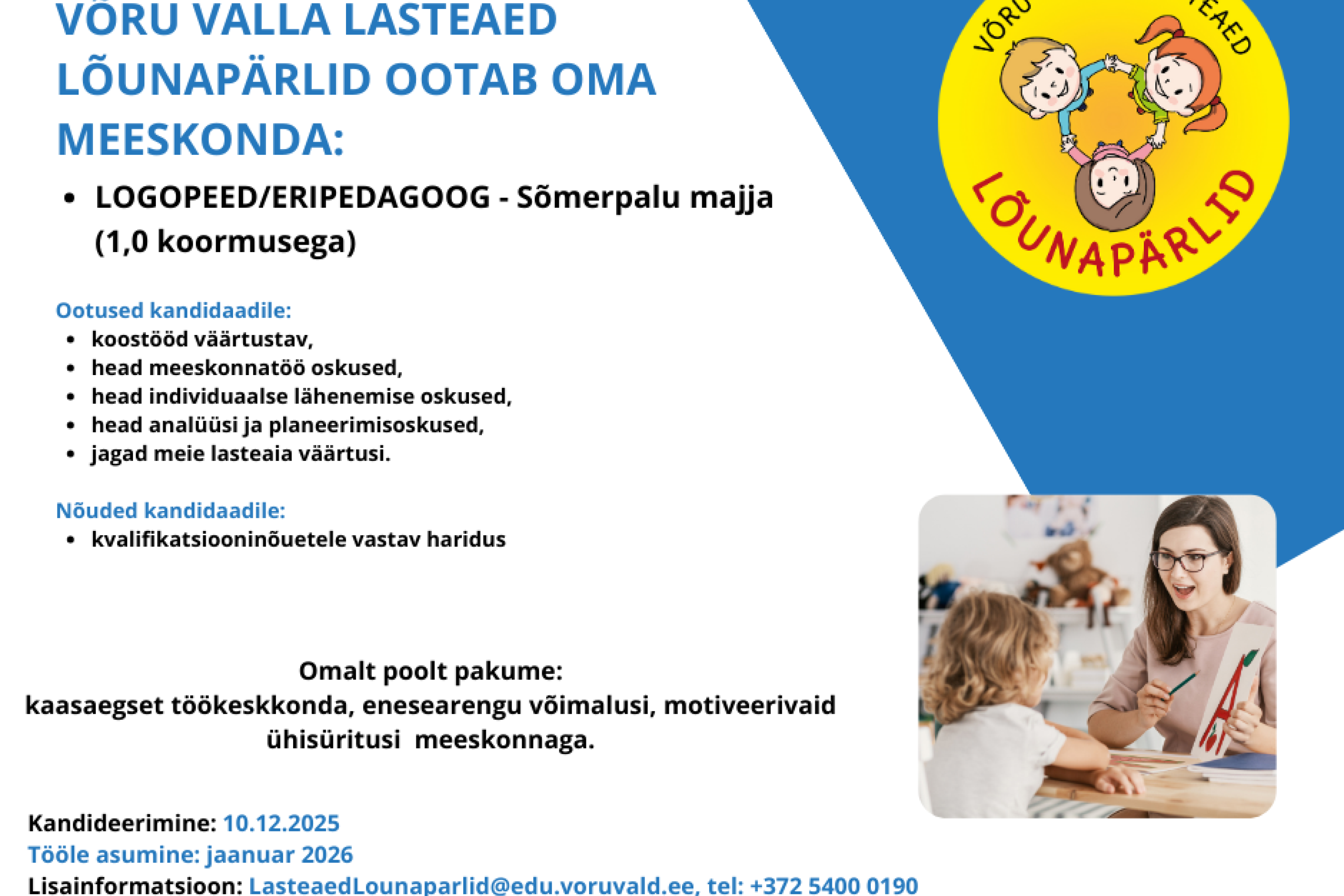 Tööpakkumine - lasteaiaõpetaja Loomise kuupäev 27.11.2025 Autor Karmen Meltz Võru valla lasteaed Lõunapärlid Sõmerpalu maja õpetajad said inspiratsiooni Erasmus+ koolitustelt. Loomise kuupäev 06.11.2025 Autor Anneli Laursoo-Dunaiski Väimela maja tähistab 80. aastapäeva. Loomise kuupäev 08.10.2025 Autor Anneli Laursoo-Dunaiski Võru maakonna haridustöötajate ja täiskasvanuhariduse tänusündmus Loomise kuupäev 29.09.2025 Autor Anneli Laursoo-Dunaiski Vaata rohkem