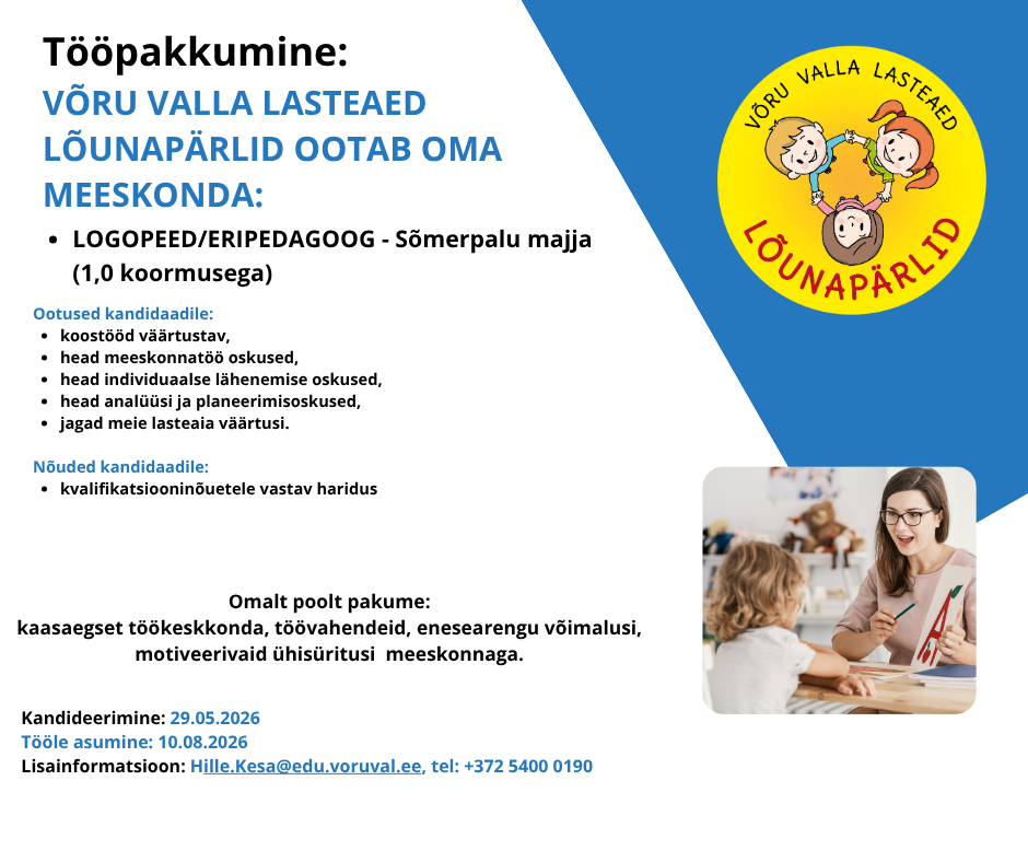 Ootame Sõmerpalu majja logopeed/eripedagoogi. Kandideerima on oodatud ka ainult logopeedi või eripedagoogi pädevusega spetsialistid.