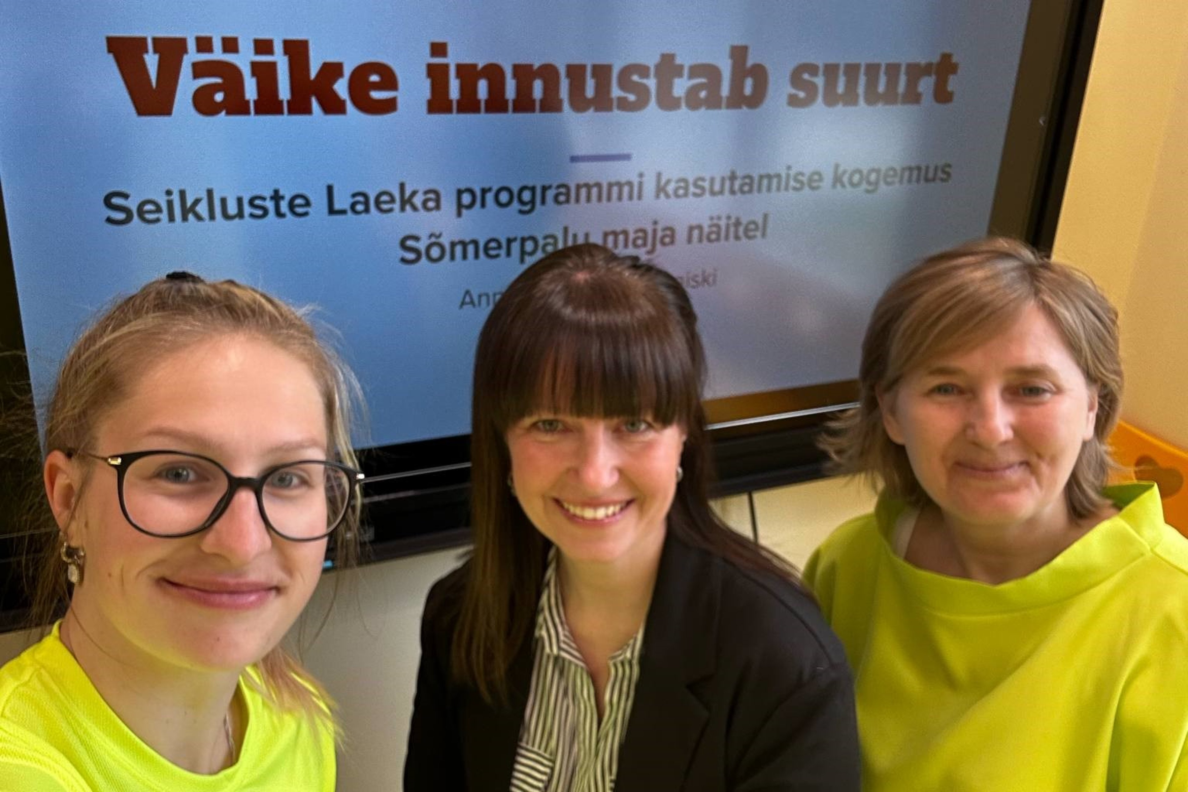 Sõmerpalu maja muusika- ja liikumisõpetaja Helena Helekivi, Mummukeste rühma õpetaja Grete Kuuda, õppe- ja arendusjuht Anneli Laursoo-Dunaiski käisid Võru maakonna metoodikaseminaril läbi viimas töötuba "Väike innustab suurt liikuma" Seikluste Laeka programmist tulenevatest mõtetest innustust saades.